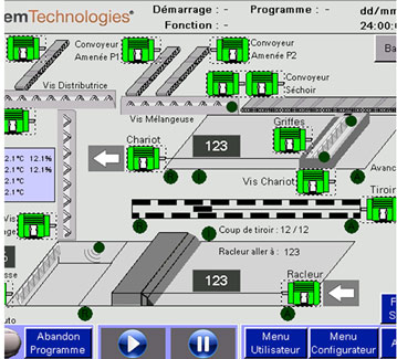 - Concevoir un poste de commande pour chaque secteur de production de l’usine incluant un écran tactile et des pages animées indiquant l’état du procédé et des équipements en vue de faciliter le travail des opérateurs